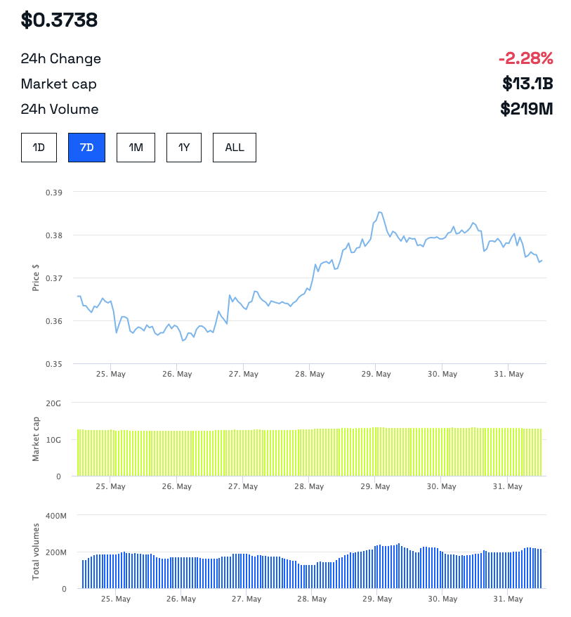 The ADA weekly chart showed a 1.9% increase in the token’s price to $0.375. The asset recently bounced off the local trend line at $0.35 and was on an uptrend until May 29, when it reached a seven-day peak of $0.385.
