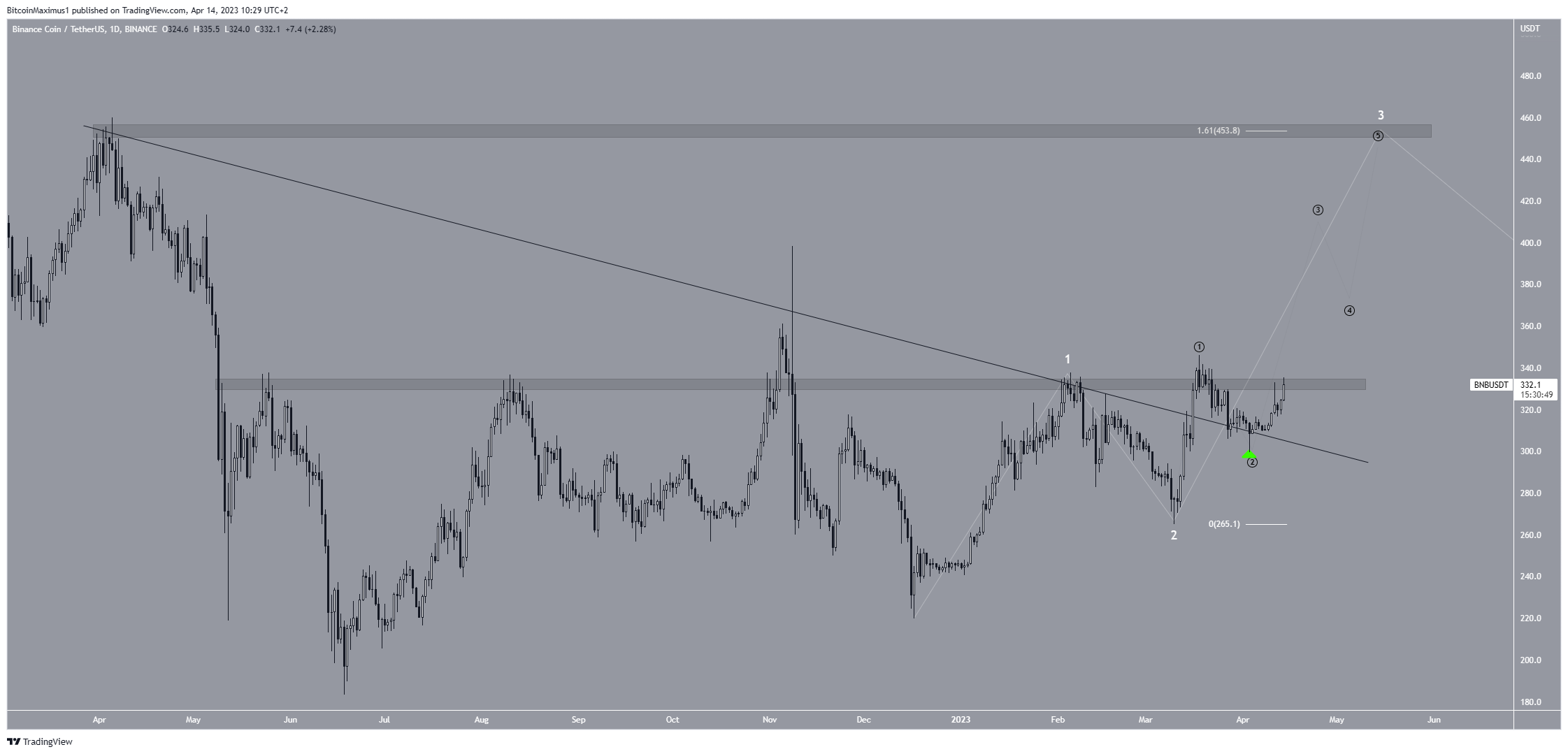 The wave count also supports the increase. It suggests that the price is in wave three (white) of a five-wave upward movement. The sub-wave count is given in black, also indicating that the price is in sub-wave three. As a result, BNB could be in the portion of the movement in which the rate of increase accelerates.
