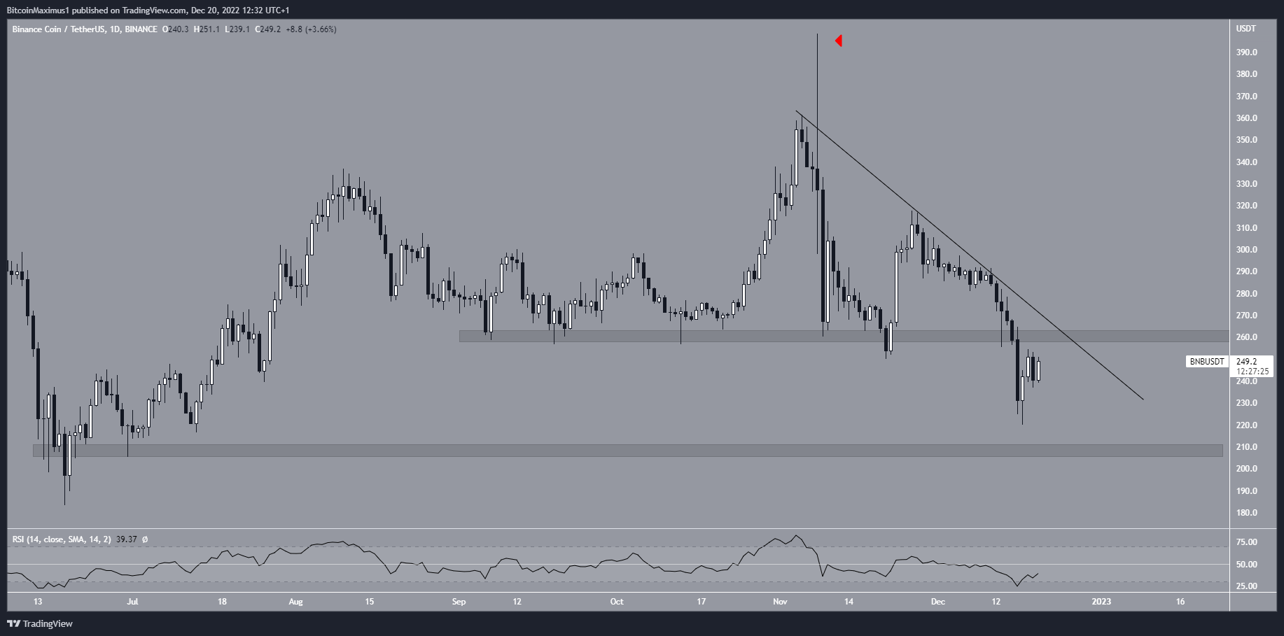 BNB is the native token of the Binance exchange and the Binance Smart Chain. The BNB price has decreased underneath a descending resistance line since reaching a high of $398.30 on Nov. 3. The same day, it created a massively long upper wick (red icon). The downward movement led to a low of $220 on Dec. 17 and caused a breakdown from the $260 horizontal support area.