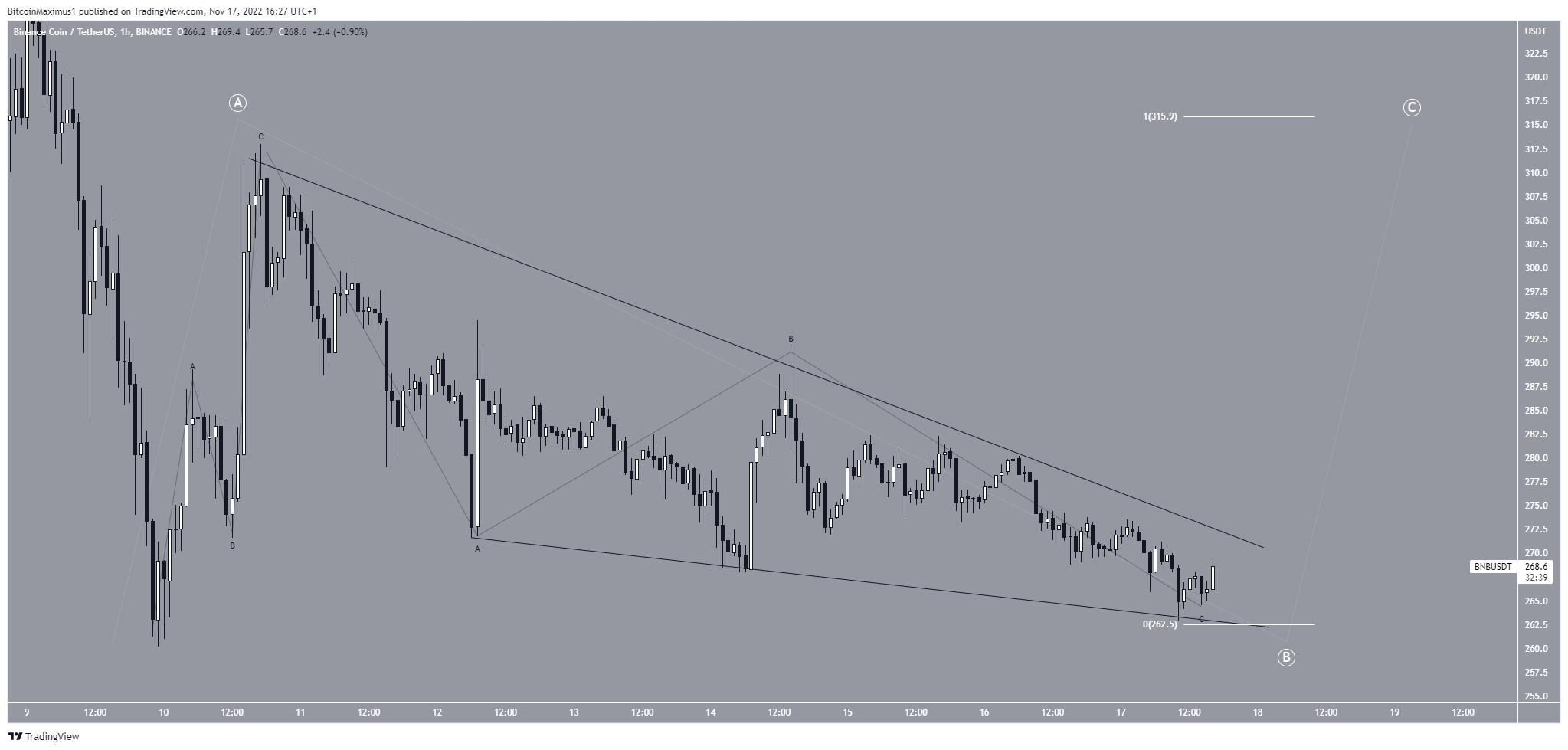 The movement after the Nov. 9 bounce resembles a three-wave structure. The highest price reached after the bounce was $313. Afterward, the BNB price decreased inside a descending wedge, a bullish pattern. The decrease also looks like a three-wave structure.