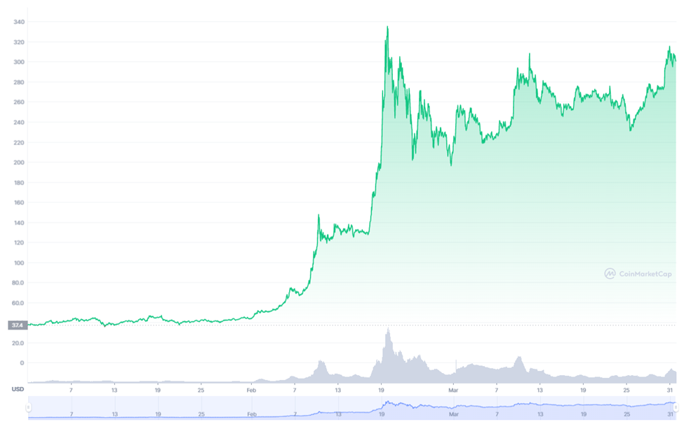 By comparison, Binance Coin opened on Jan 1 2021 at $37.37, reached a quarterly high of $342.88 on Feb 20, and closed the first quarter of 2021 at $302.06. Overall, there was a 708% increase between BNB’s opening and closing price in Q1 2021.