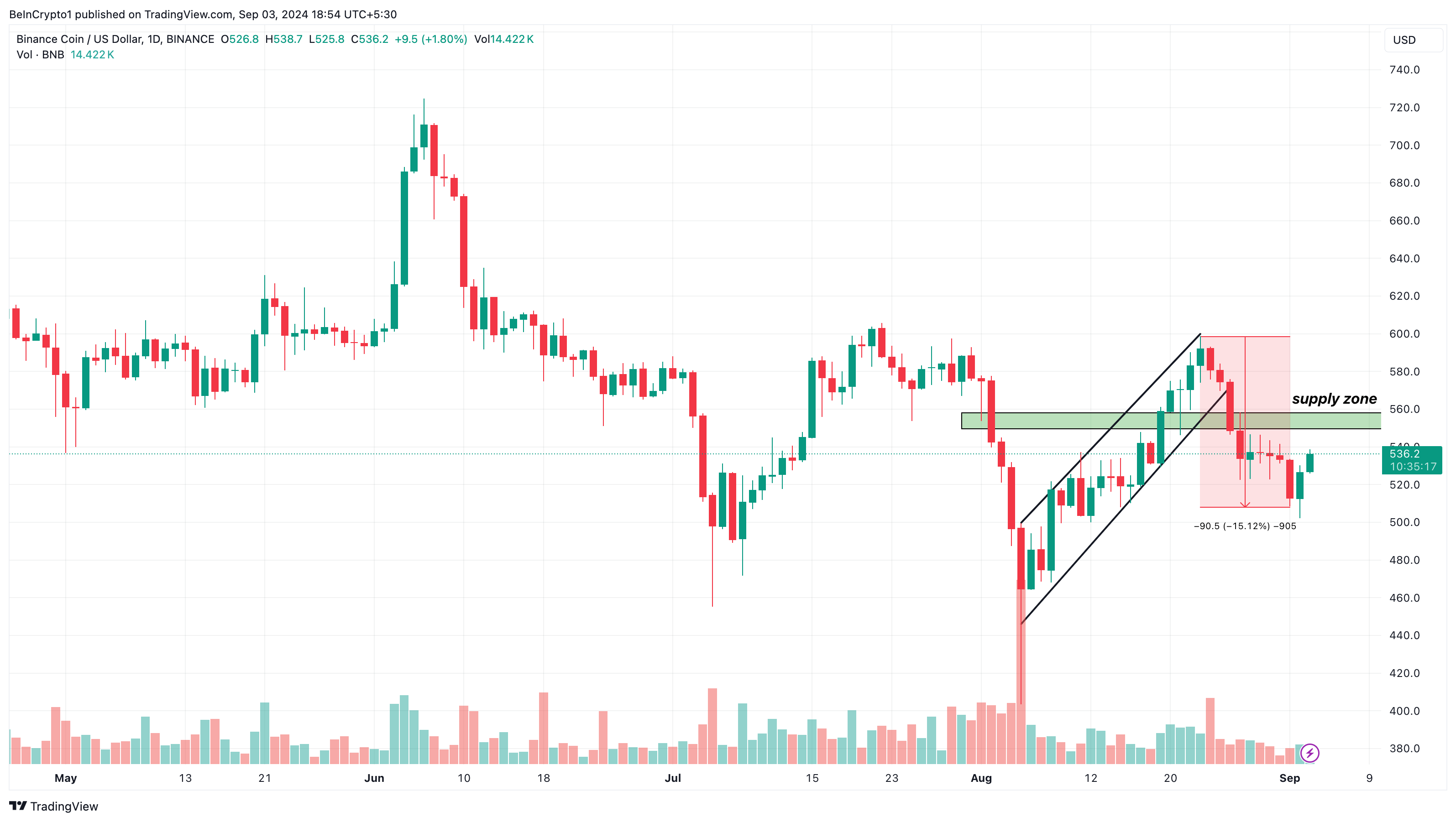 In August, BNB price formed an ascending channel on the daily chart. As a result, the cryptocurrency was able to move from $464 to $600. However, the 15% decrease after that threatened its price action with an indicator suggesting another price crash like what happened on August 5.