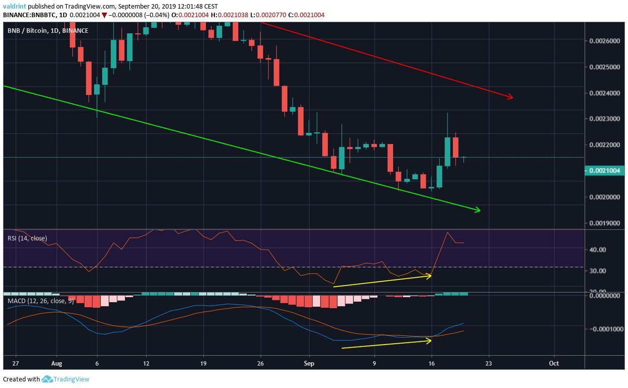 On September 17, the BNB price reached a low of 19,652 satoshis. A rapid upward move followed, and BNB reached a high of 22,880 satoshis the next day. It has been decreasing since.