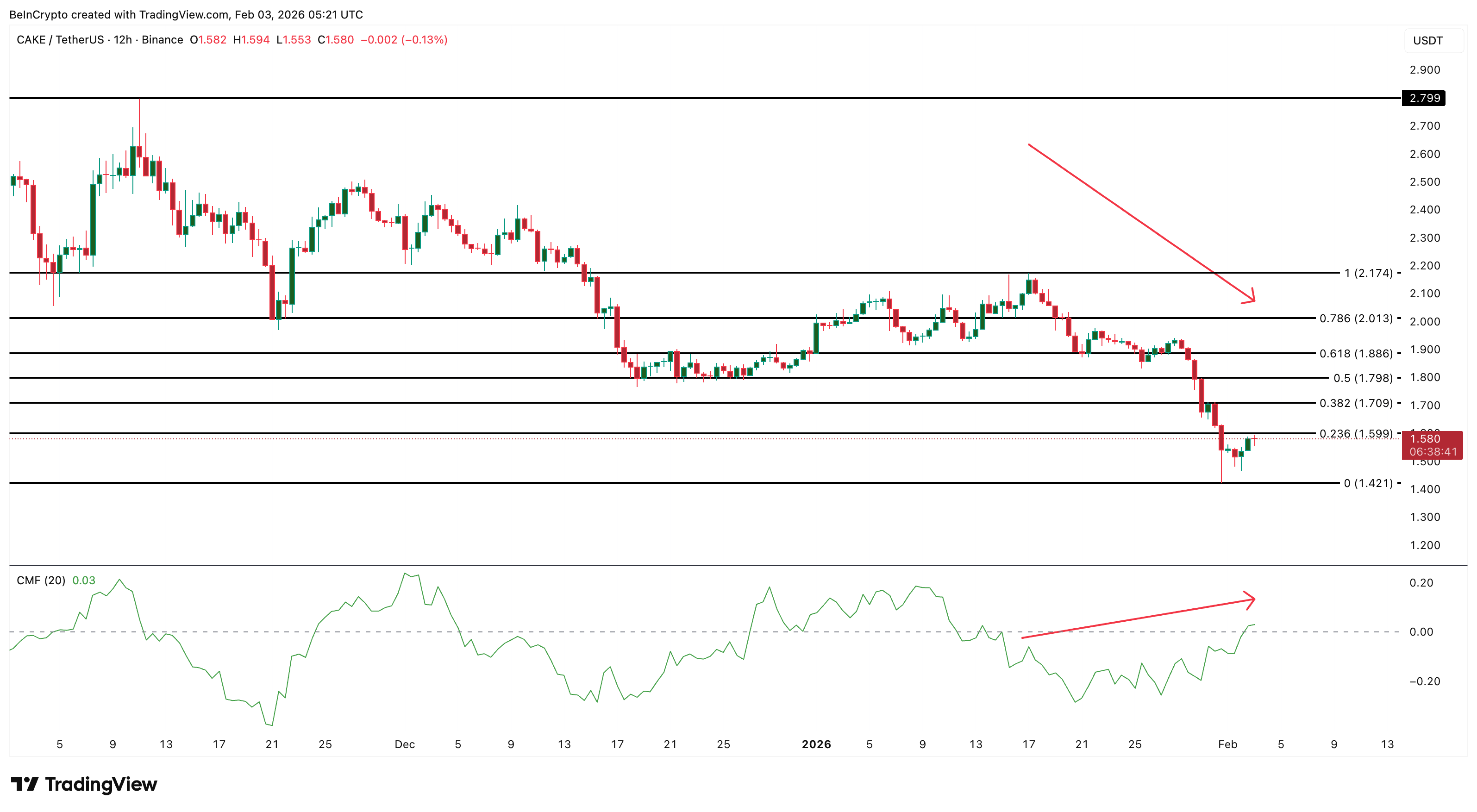 From a technical perspective, CAKE faces clear resistance near $1.59. A strong 12-hour close above this level could open a move toward $1.88 and then the psychological $2.00 zone. On the downside, $1.42 remains critical support. A breakdown below this level would weaken the bullish structure.