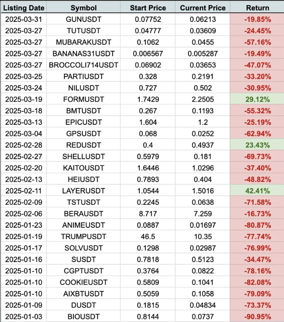Meanwhile, while Binance listings have historically been market-moving events, often triggering massive short-term price surges, recent data paints a different picture. A growing number of tokens listed on Binance have seen steep post-listing declines.
