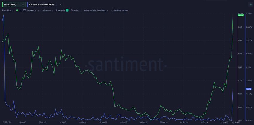 Following the Binance listing, media mentions of Ordinals have gone through the roof. As seen in the Santiment chart below, ORDI Social Dominance hit a 4-month peak of 1.34% on November 7.