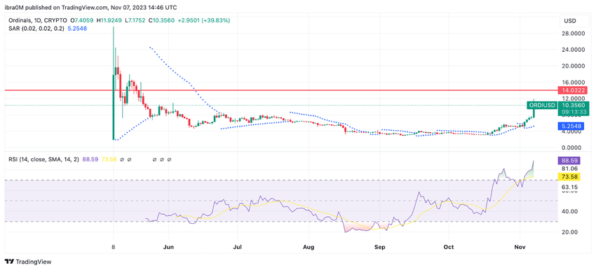 Ordinals (ORDI) price rallied by more than 90% to hit a new 4-month peak of $10.40 on Tuesday, November 7. Will the Binance listing spark a prolonged ORDI price rally?