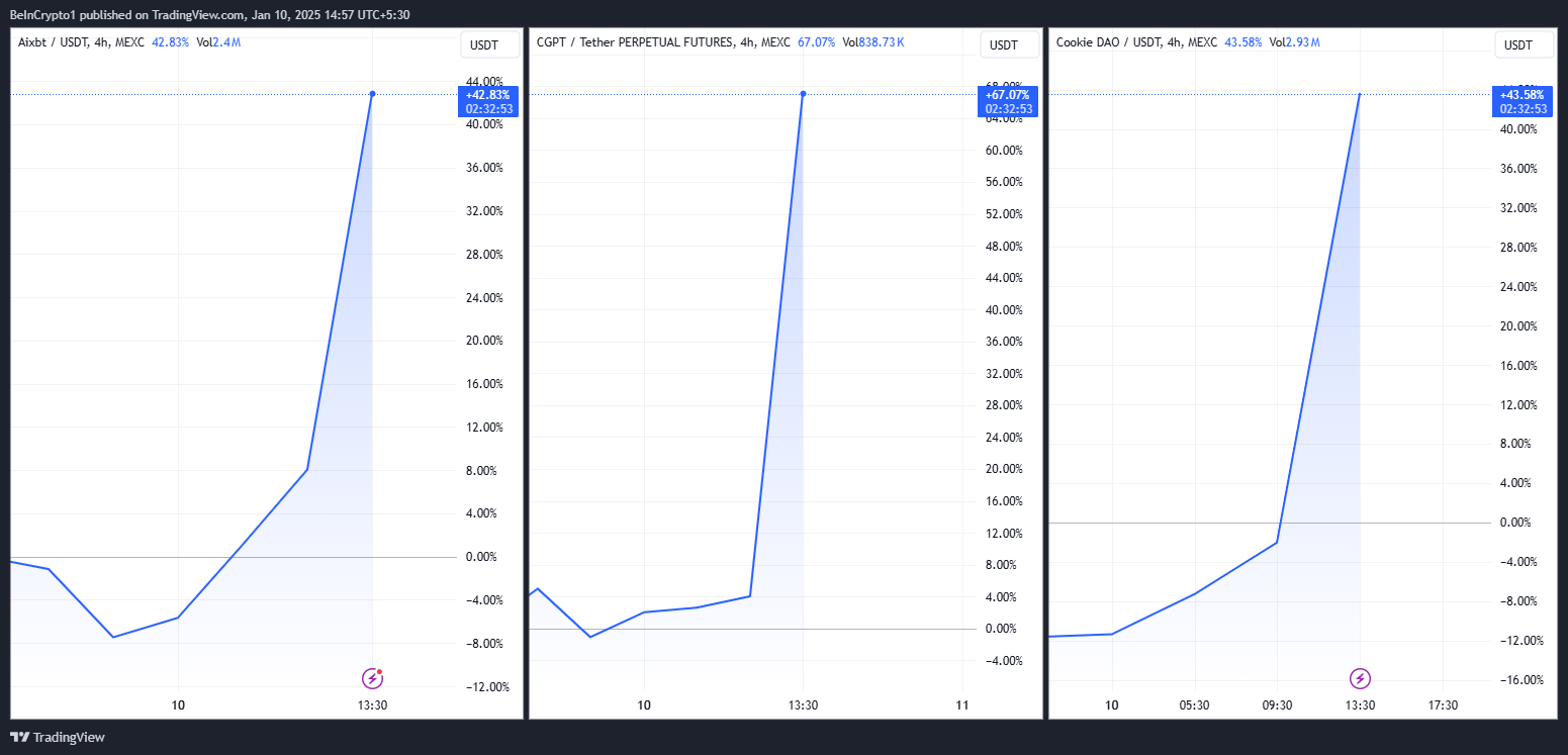 Three tokens, aixbt by Virtuals (AIXBT), ChainGPT (CGPT), and Cookie DAO (COOKIE), were on a tear on Friday, soaring by over 40% following the Binance listing announcement.