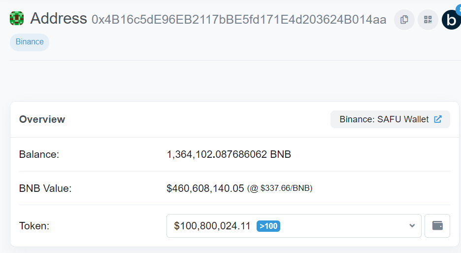 The fund’s BNB and USDT wallet contains roughly 1,364,102 BNB or $458,257,191.