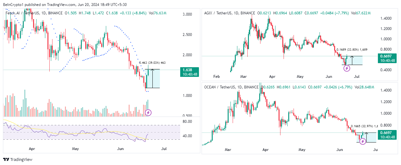 AI crypto coins are rallying on the back of this news, with AGIX, OCEAN, and FET leading by double digits.