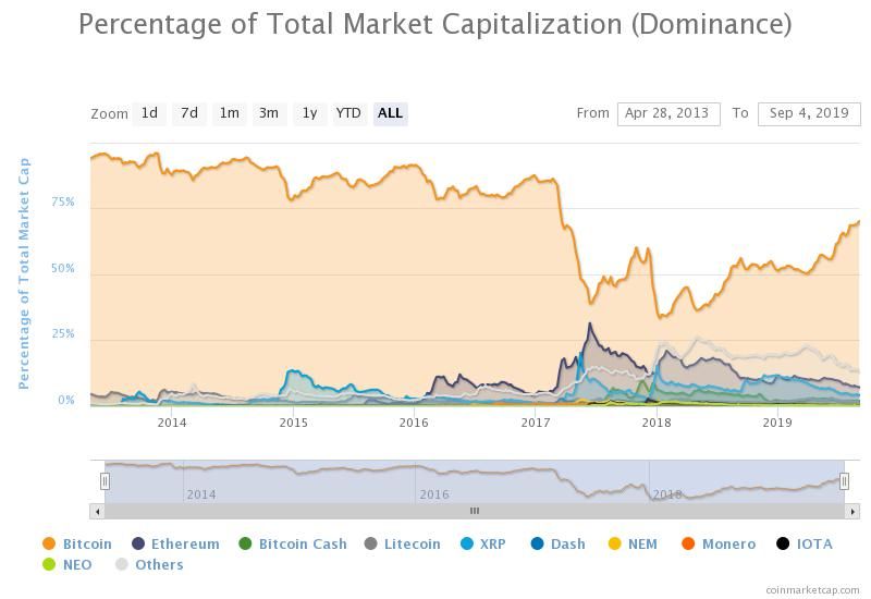Of course, if you take the entire history of cryptocurrency, instead of a cherry-picked set of dates, Bitcoin dominance being below 70 percent is much more of a historical anomaly.