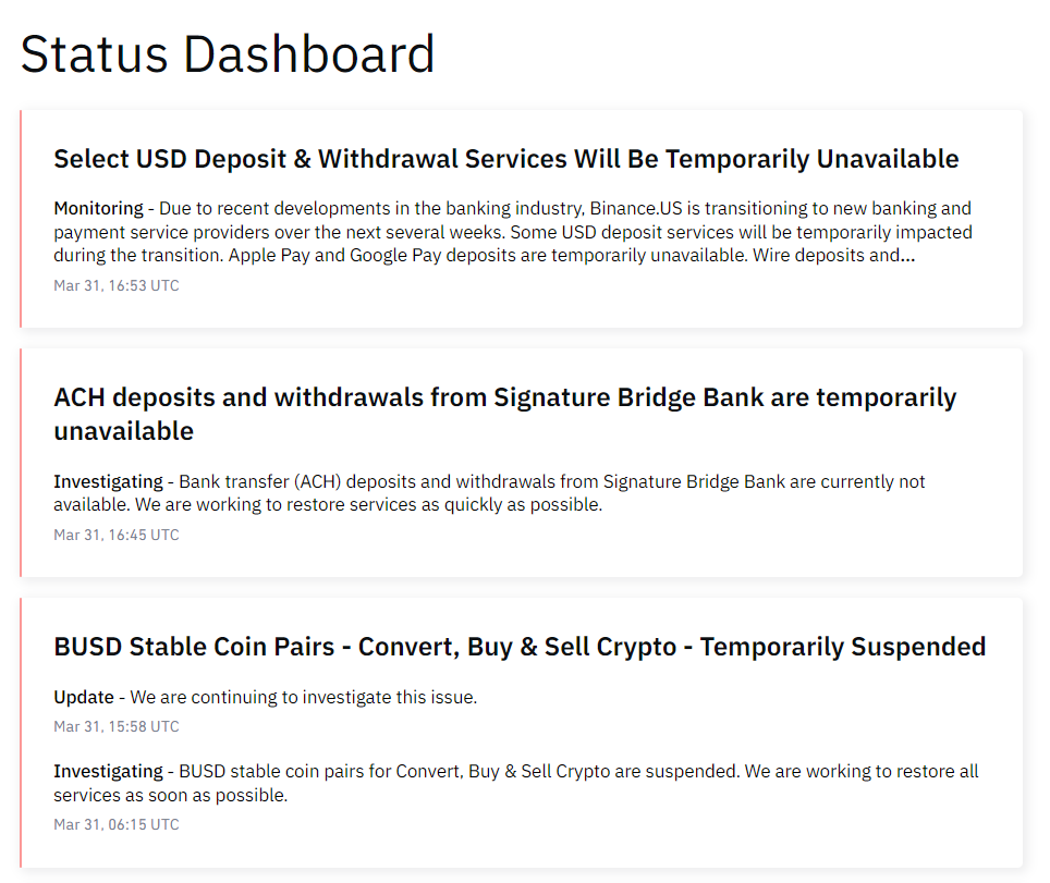 Binance.US users would experience issues depositing and withdrawing US dollars (USD) on the platform because of the recent banking crisis bedeviling the crypto industry, according to the exchange’s status page.