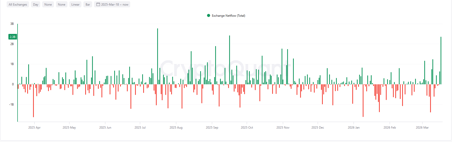 Separate CryptoQuant data shows that total stablecoin netflows to exchanges exceeded $2.3 billion, the highest level since Q4 last year.