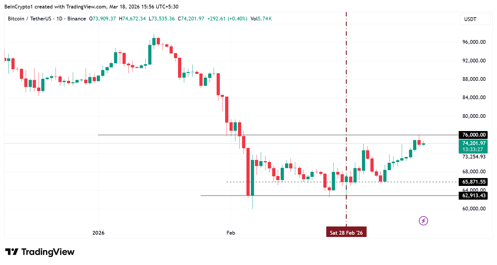 Bitcoin has shown relative resilience throughout the downturn, trading just above $74,200 as of this writing.