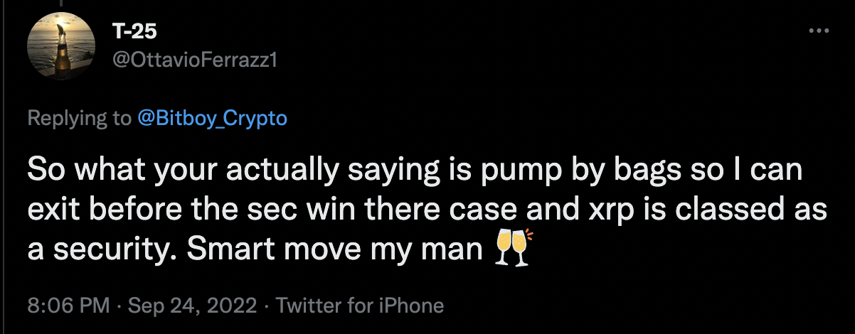 The community speculates that BitBoy has got a big bag of XRP. They believe that once he starts shilling a project, starts running away from the project. A Twitter user accuses Ben that he is pumping XRP because he wants to get out before the SEC wins the case and XRP is declared a security.
