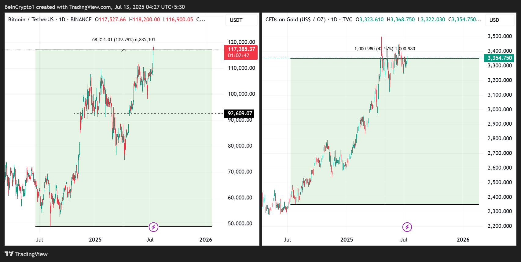 Bitcoin is up nearly 140% year-to-date, while gold is up just over 40%.