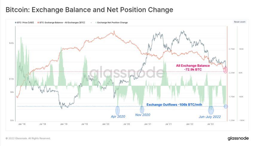 Data from Glassnode shows that following the collapse of FTX, Bitcoin investors have been withdrawing coins to self-custody at a historical rate of 106,000 BTC/month. Similar exchange outflow spikes only took place three other times in BTC’s history: in April 2020, November 2020, and June-July 2022.