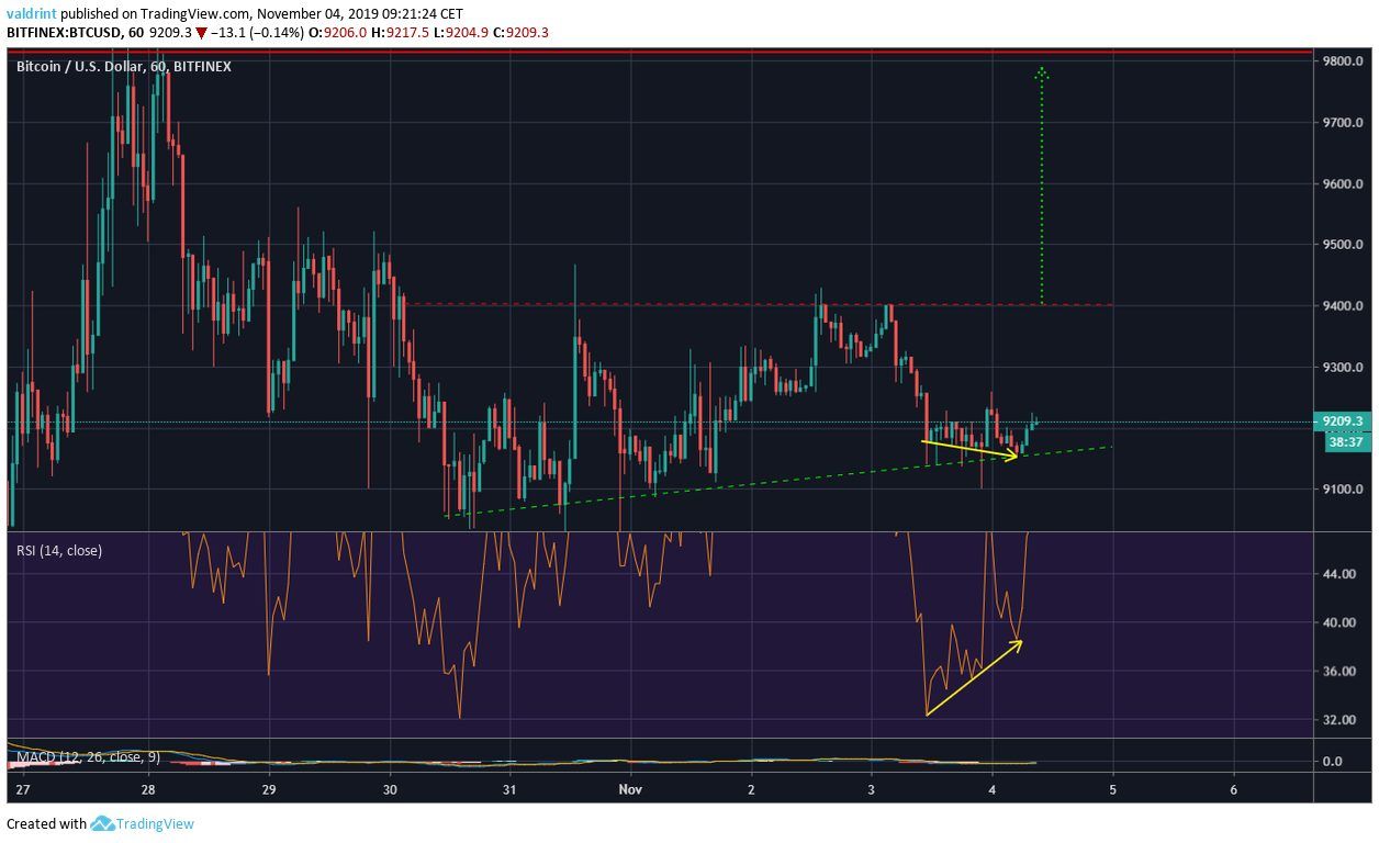 After breaking out from a descending wedge on Oct 26, the price of Bitcoin has decreased to touch a previous resistance line. It is trading inside a short-term horizontal channel and an ascending triangle. The bullish divergence in the RSI inside a bullish pattern makes it likely that it will break out from the triangle and head towards the resistance line at $9800.