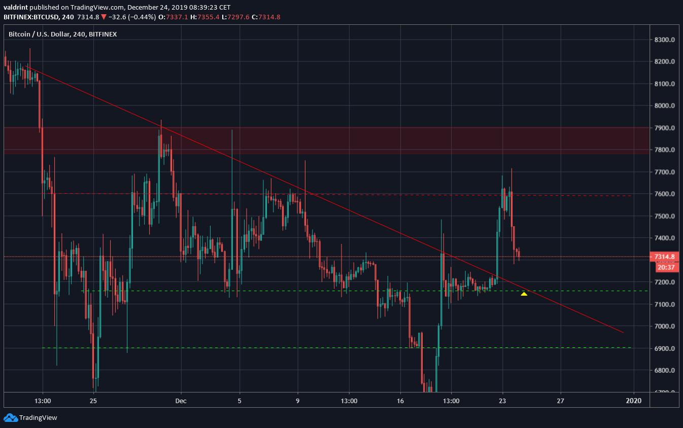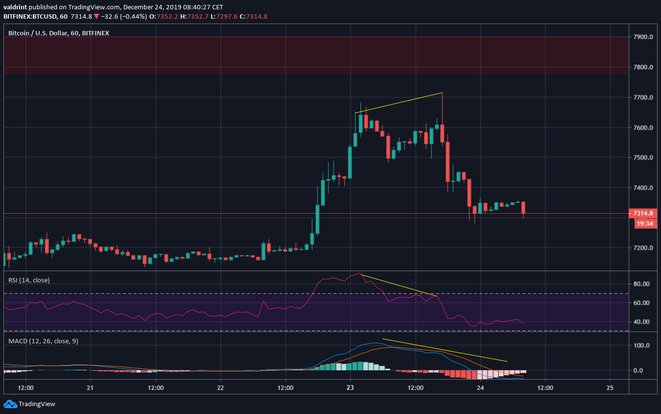 Since December 18, the Bitcoin price has increased by 20 percent. However, the rally ended yesterday at $7715 and the price is in the process of retracing towards support.