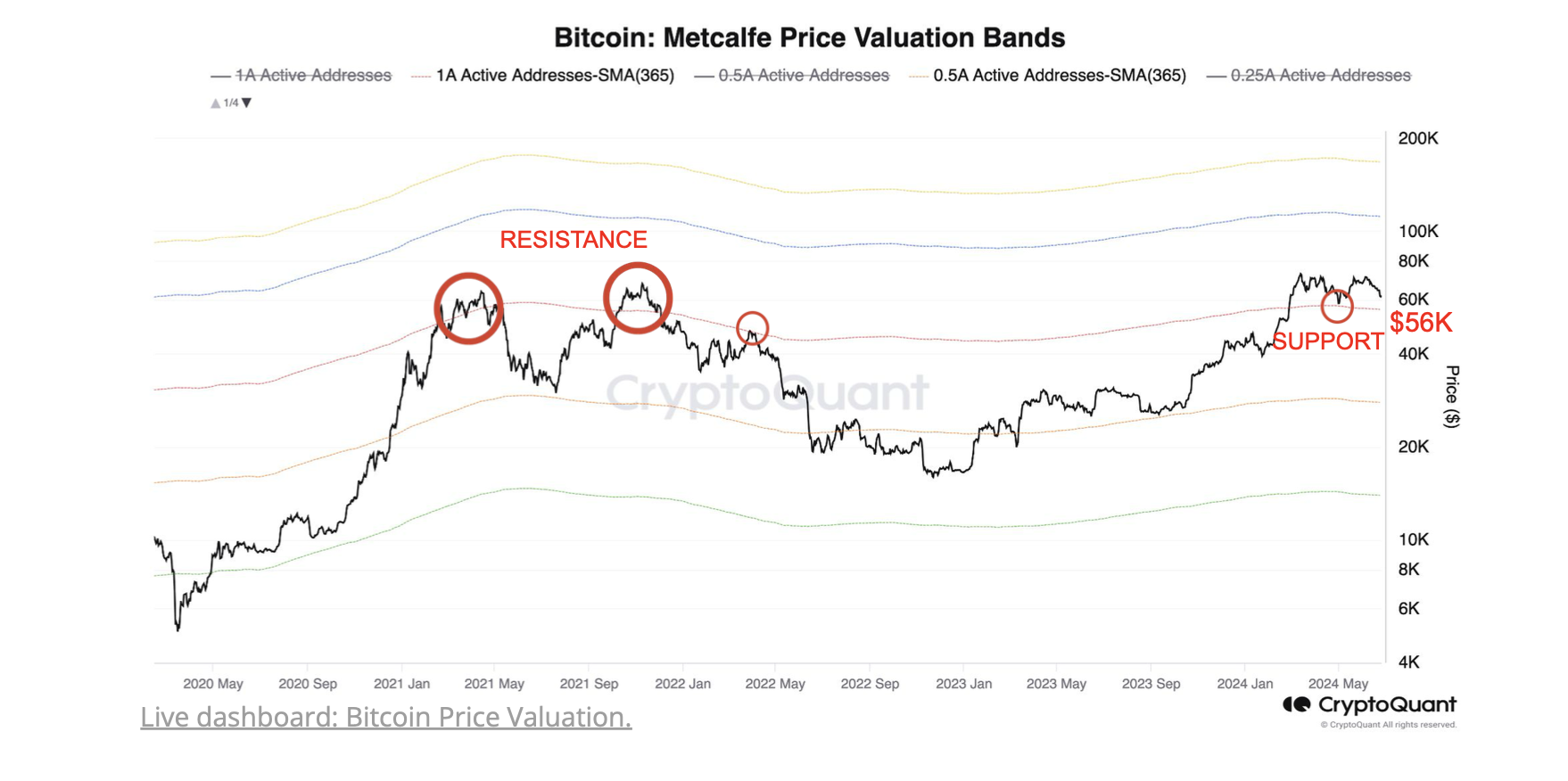The final indicator to watch is Bitcoin’s support level, currently pegged at $56,000 based on Metcalfe’s price valuation bands.
