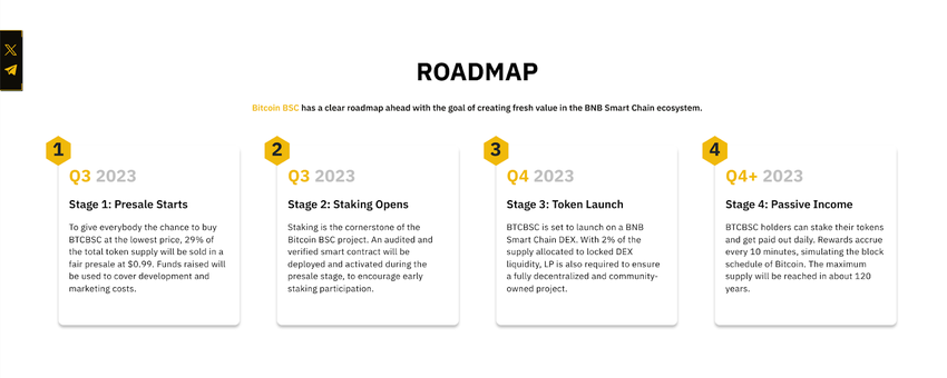 The Bitcoin BSC roadmap has four stages, focused on long-term growth and creating a high-potential token launch.