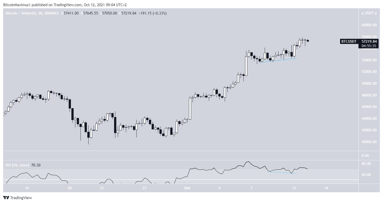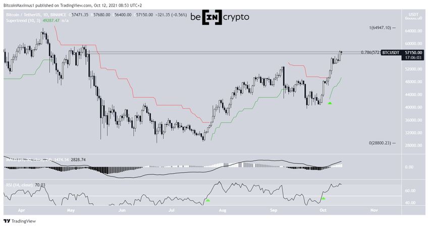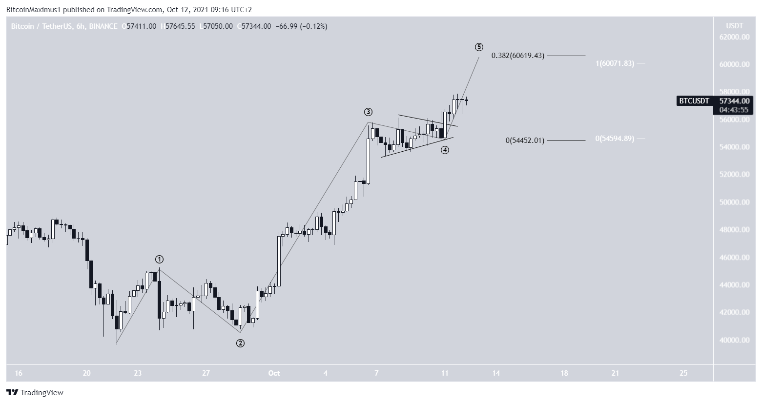 BTC increased considerably on Oct 11, creating a large bullish candlestick, which took it inside the $57,200 resistance. This is the 0.786 Fib retracement resistance level and is the final horizontal area prior to the all-time high price.