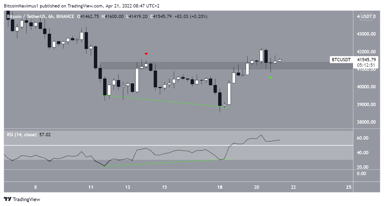 Bitcoin has been increasing above an ascending support line since Jan. 24. The line has been validated numerous times, most recently on April 18 (highlighted), when the price created a bullish engulfing candlestick.