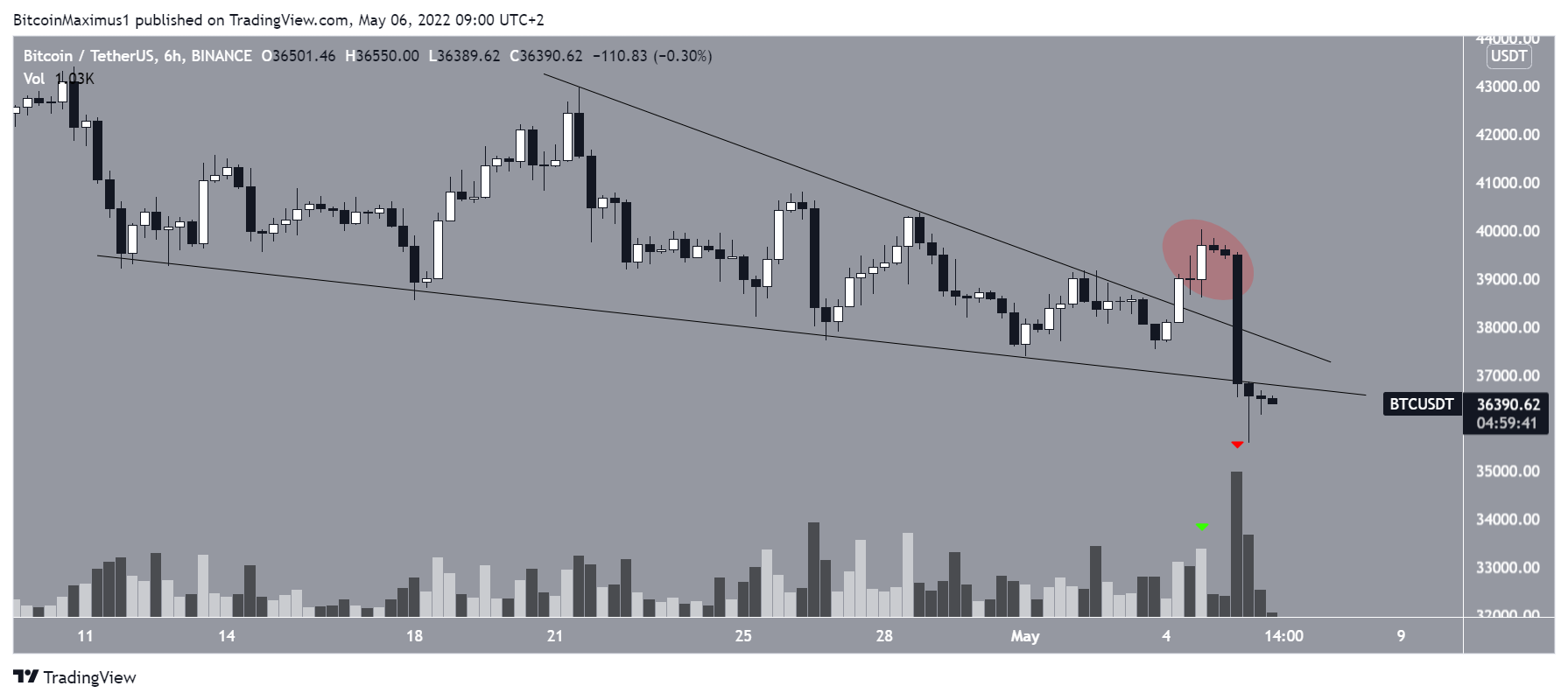 On May 5, the price created a bearish engulfing candlestick (highlighted). This caused a breakdown from the $37,800 horizontal support level, which had been in place since the beginning of March.