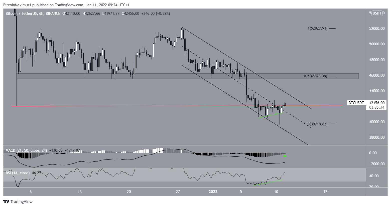 The six-hour chart shows that BTC is trading inside a descending parallel channel. This is usually considered a corrective pattern, meaning that a breakout above the channel would be eventually expected.