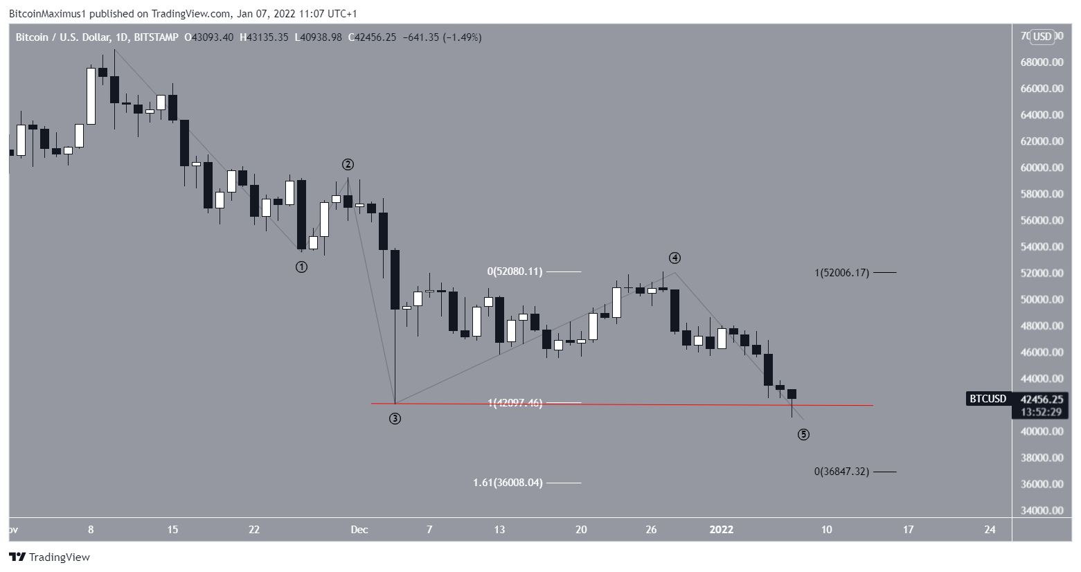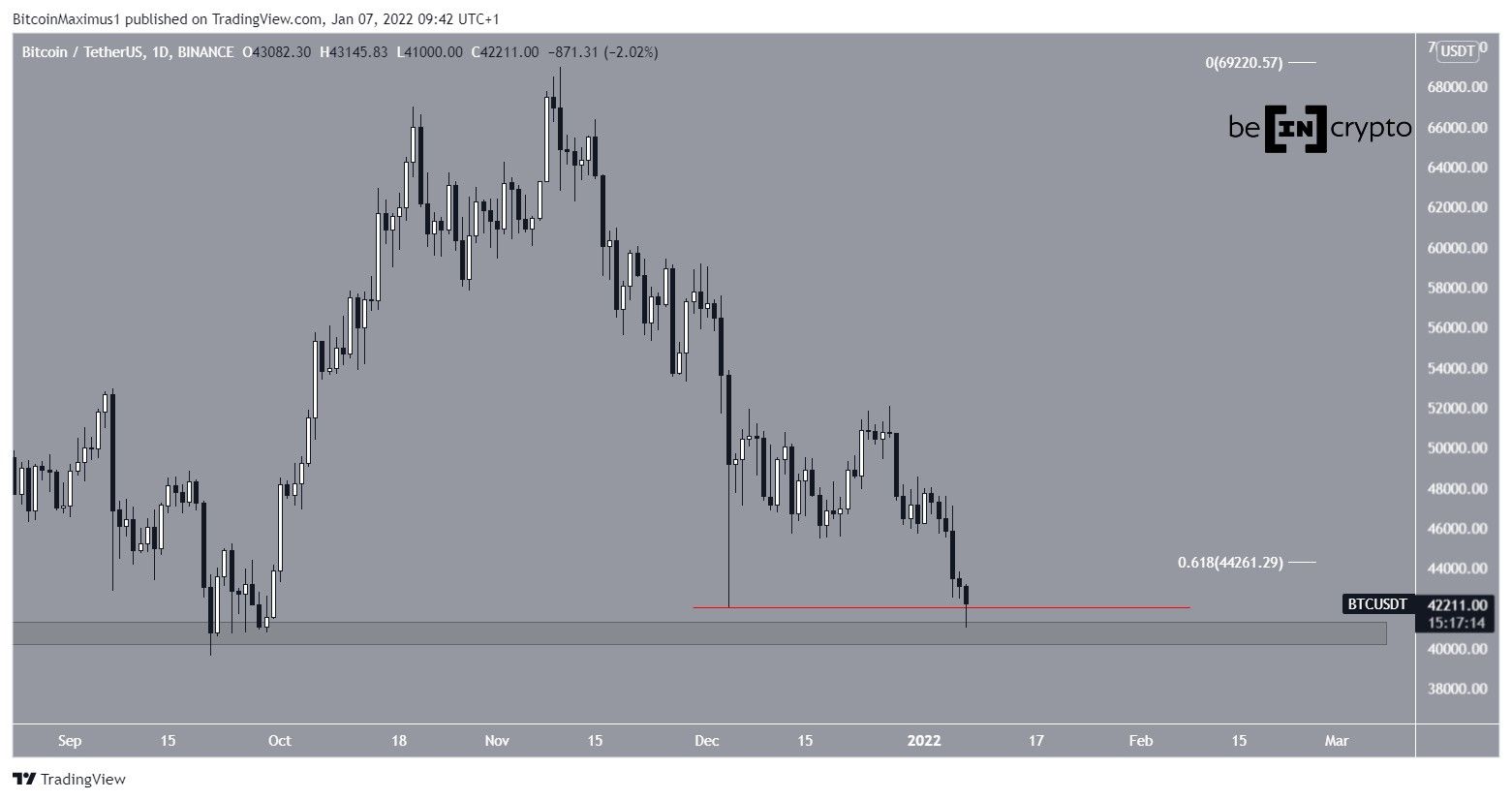 After breaking down from a 32-day support area, Bitcoin (BTC) proceeded to reach a low of $41,000 on Jan 7 and is testing a horizontal support.