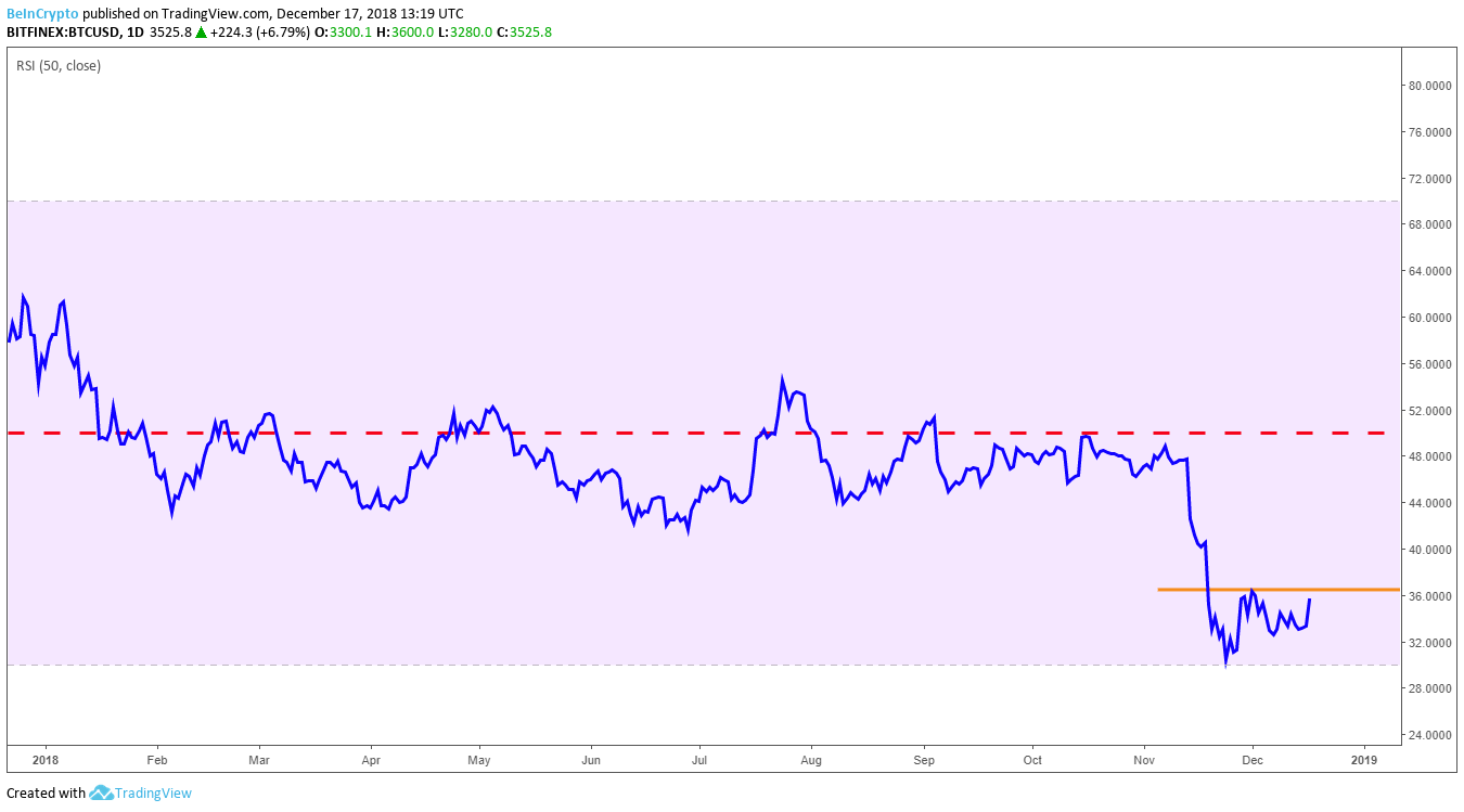 Taking a look at Bitcoin’s (BTC) relative strength index (RSI), it appears as though BTC is about to test the resistance to make a double top at 36.