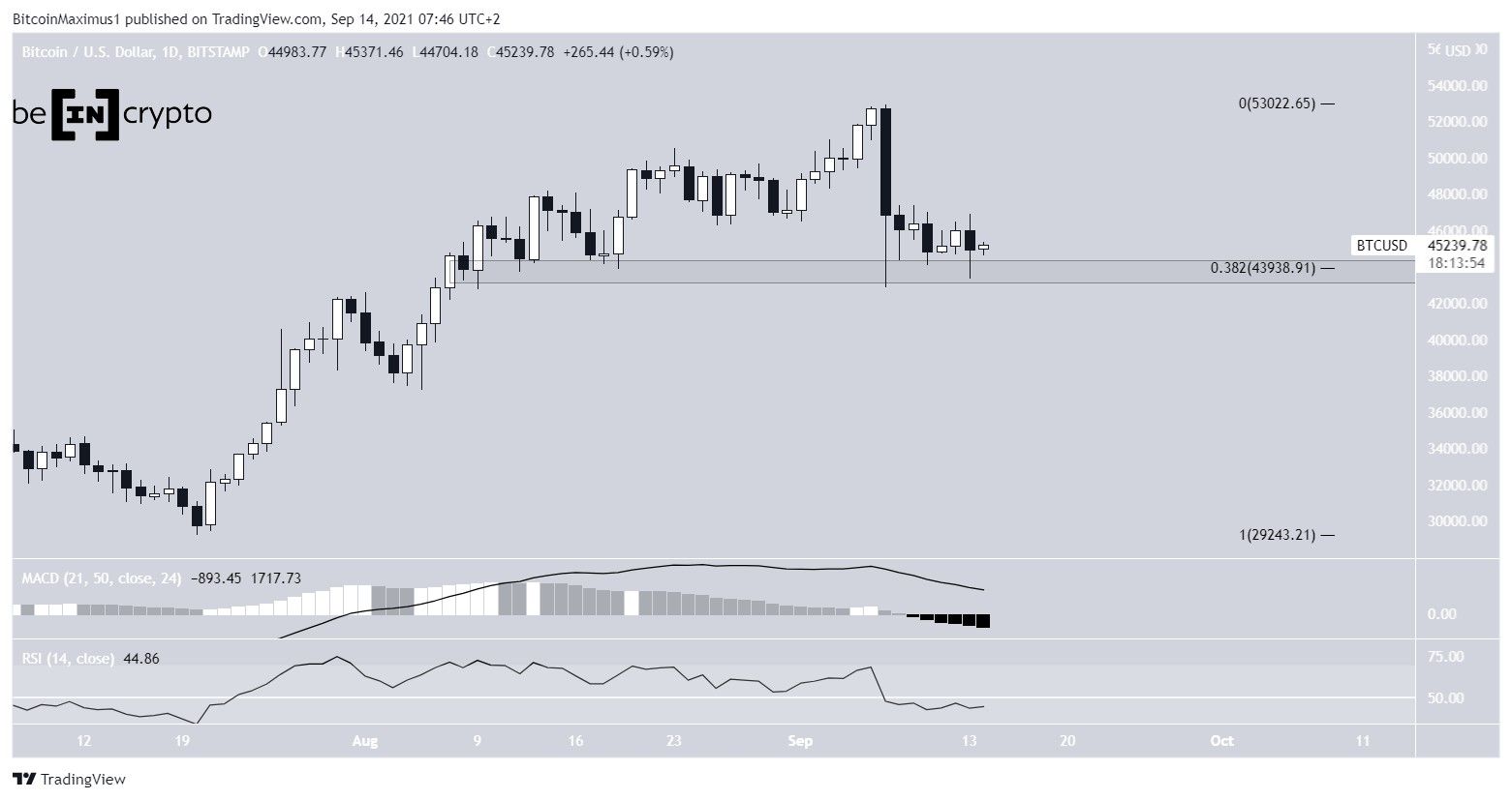 Bitcoin (BTC) fell on Sept 14, reaching a low of $43,400 before bouncing and closing near $45,000.