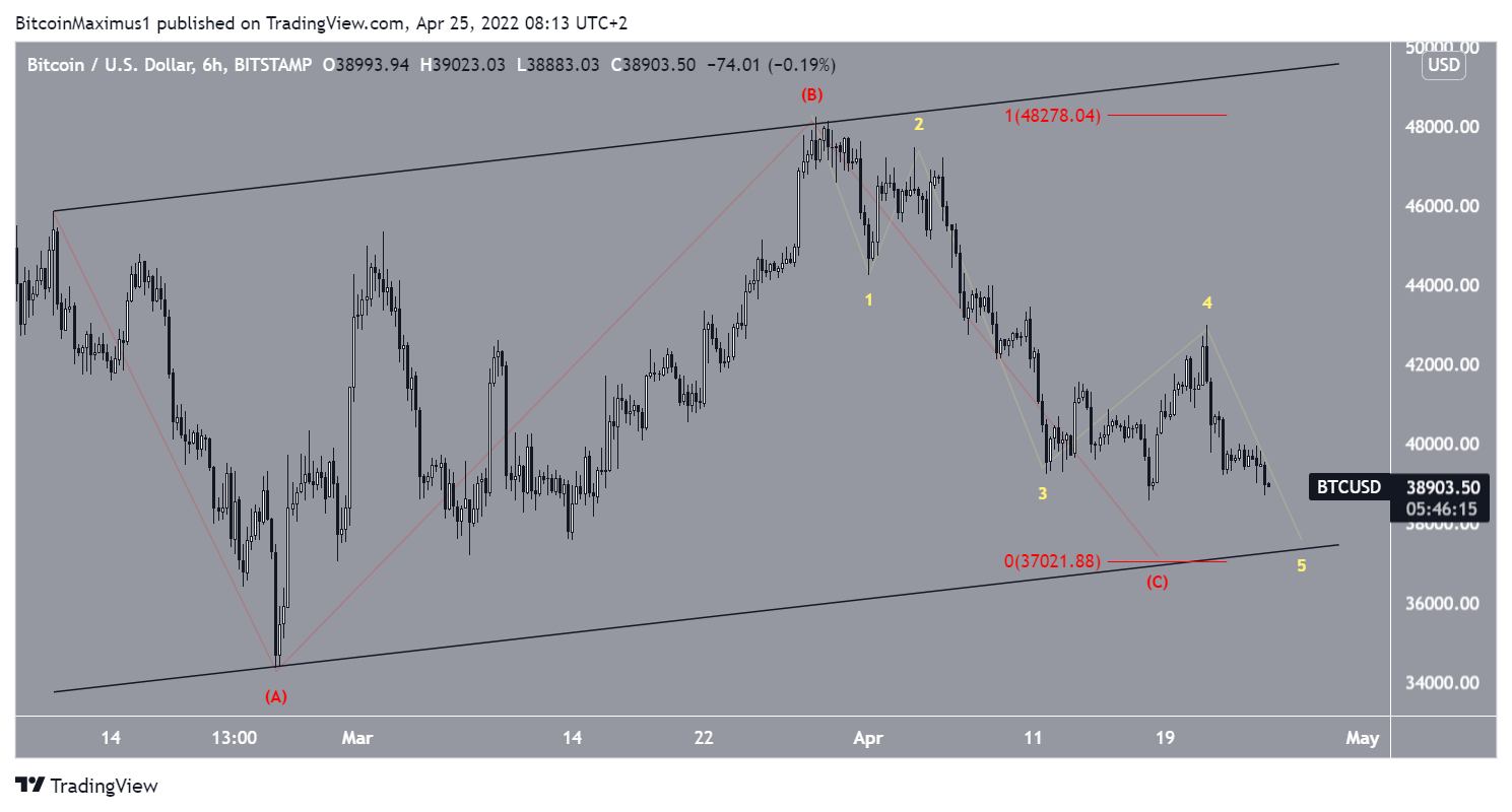 The wave count suggests that since Feb. 10, BTC has been decreasing in what could be an A-B-C corrective structure (red). If correct, it’s currently in the C wave. The sub-wave count is shown in yellow in the chart below.