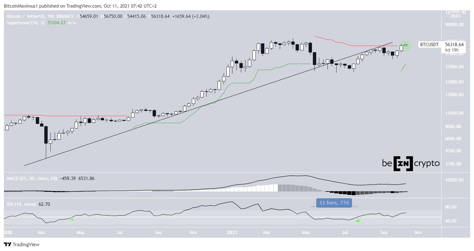 Bitcoin (BTC) created another bullish candlestick on the weekly time frame, continuing its ongoing ascent toward a new all-time high price. BTC is expected to break out above the $57,150 resistance level, which is the final one prior to the all-time high.