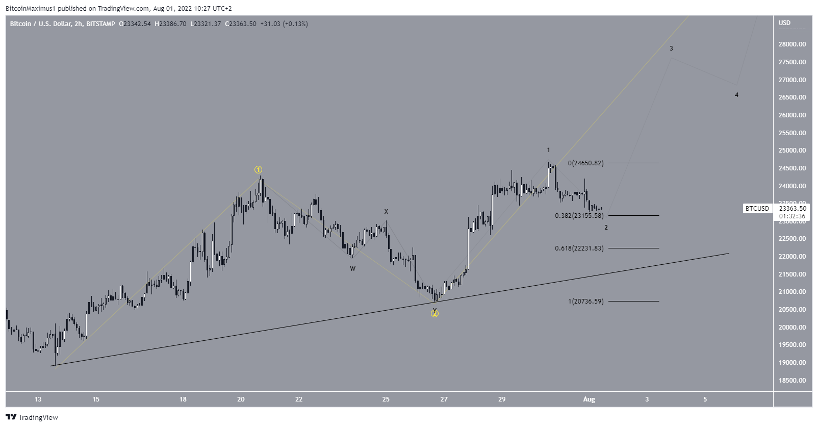 Since this seems to be a 1-2/1-2 wave formation, a decrease below the ascending support line and the 0.618 Fib retracement support level at $22,230 would invalidate this count.
