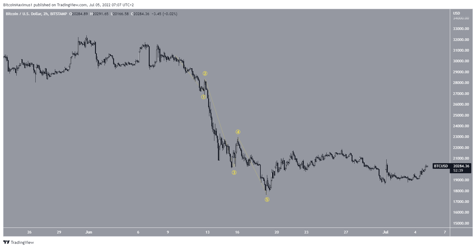 BTC has been falling underneath a descending resistance line since April 5. The line most recently caused a rejection on June 7 (red icon), leading to a low of $17,622 on June 8.