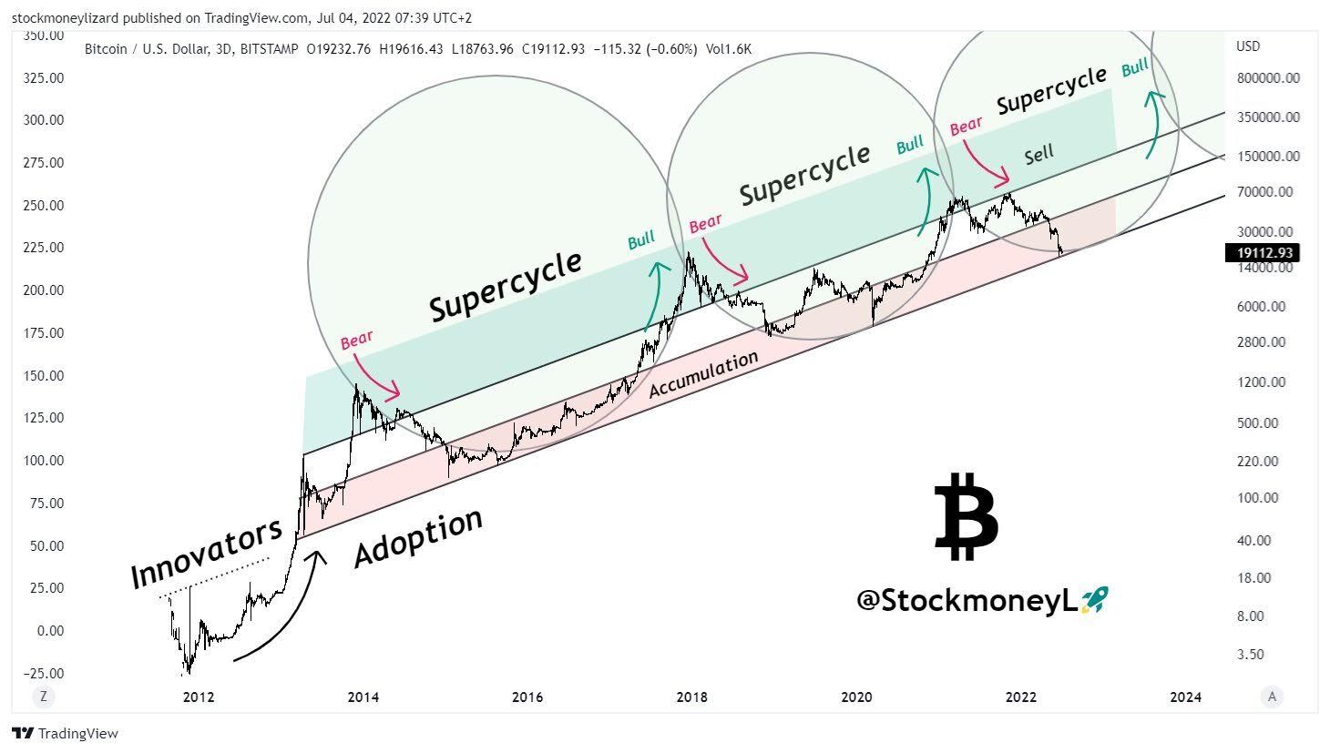 In addition, according to the author, there is a dashed line of “grand support.” The declines of successive Bitcoin cycles since the so-called “Innovators” era of 2011 to 2013 end on it.