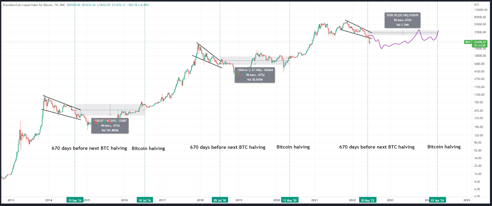 He further states: “#BTC will capitulate in the next 6 months & hit cycle bottom (anywhere between $14-21k), then chop around $28-40k in most of 2023 and be at ~$40k again by next halving.”