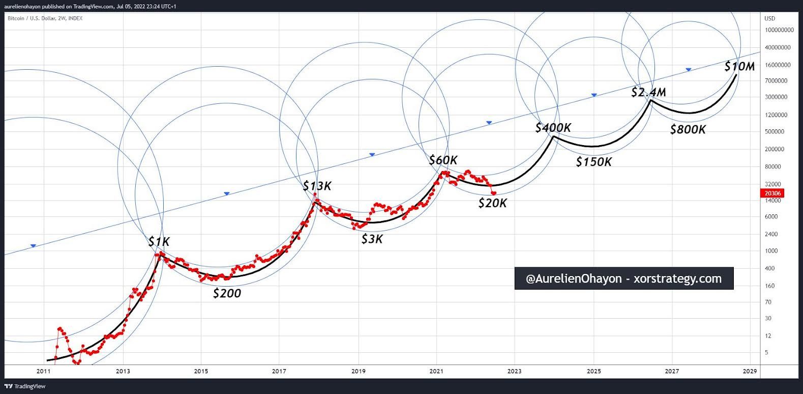 An alternative version of the hypothesis that Bitcoin cycles fit into circular patterns was presented by analyst @AurelienOhayon. His take is similar to the previous author’s second version. Here, too, the circles intersect – even more strongly than in the chart above.