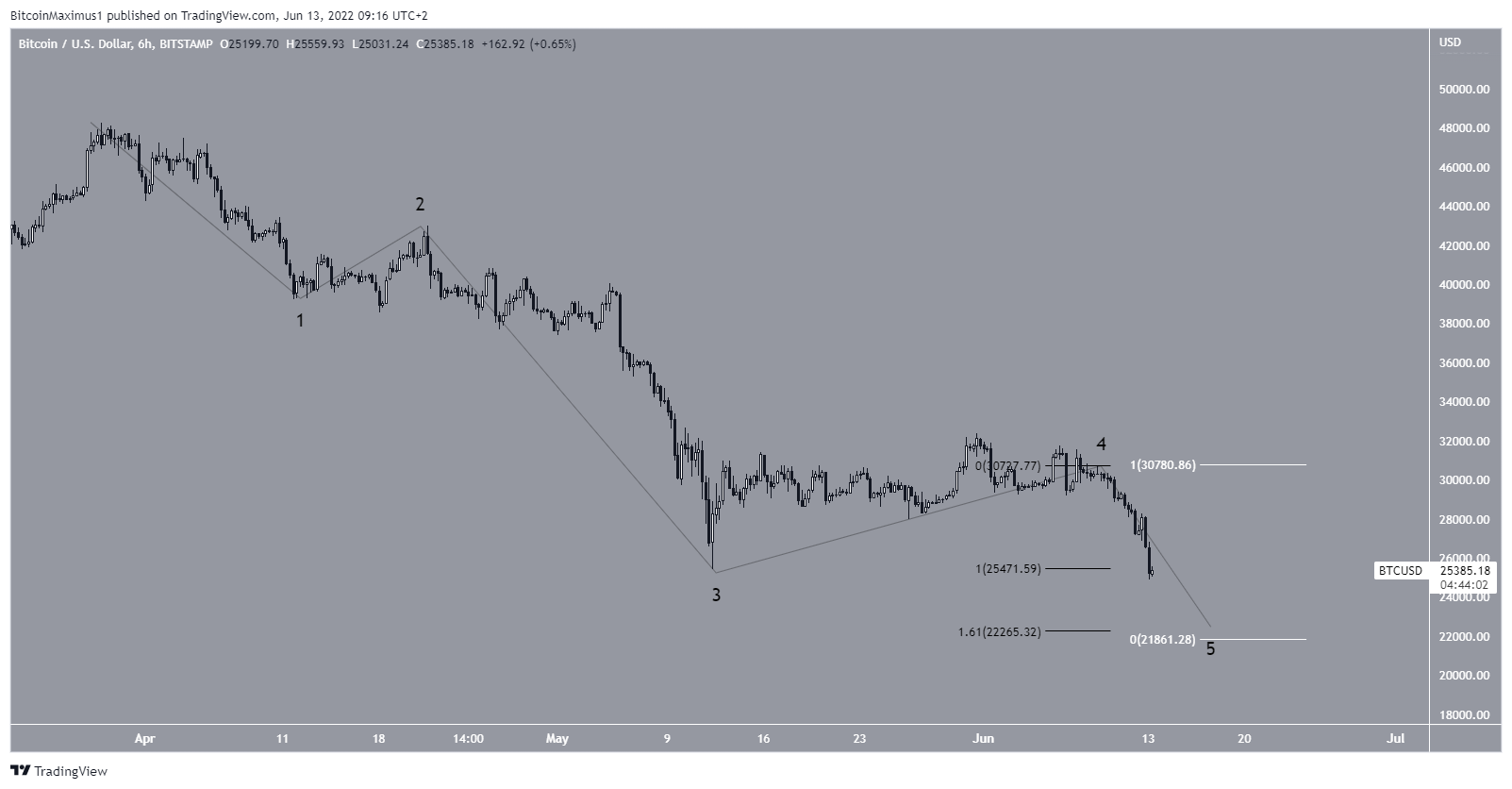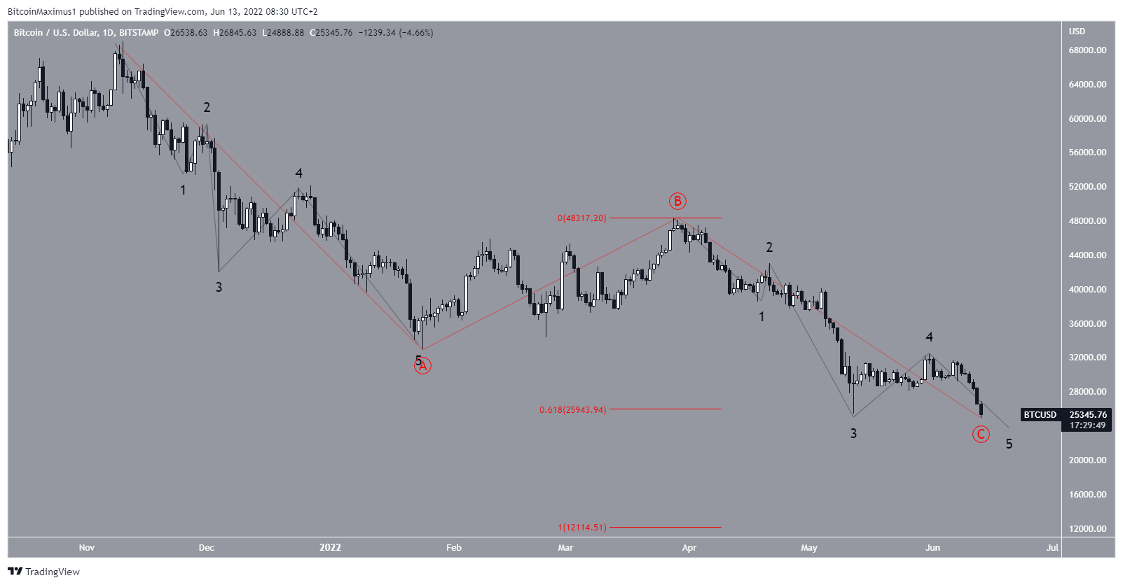 The wave count suggests that BTC is in the C wave of an A-B-C corrective structure (red). The sub-wave count is given in black, suggesting that the price is in the fifth and final sub-wave.