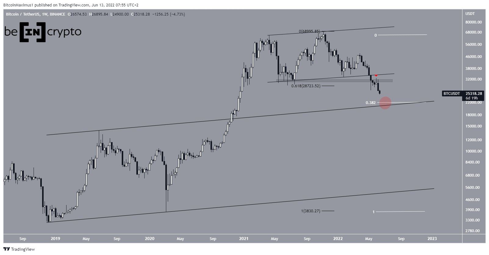 SponsoredIf the downward movement continues, the next support area is at $22,000. This is the 0.382 Fib retracement level when using a logarithmic Fib tool and the resistance line of a previous ascending parallel channel (red circle).