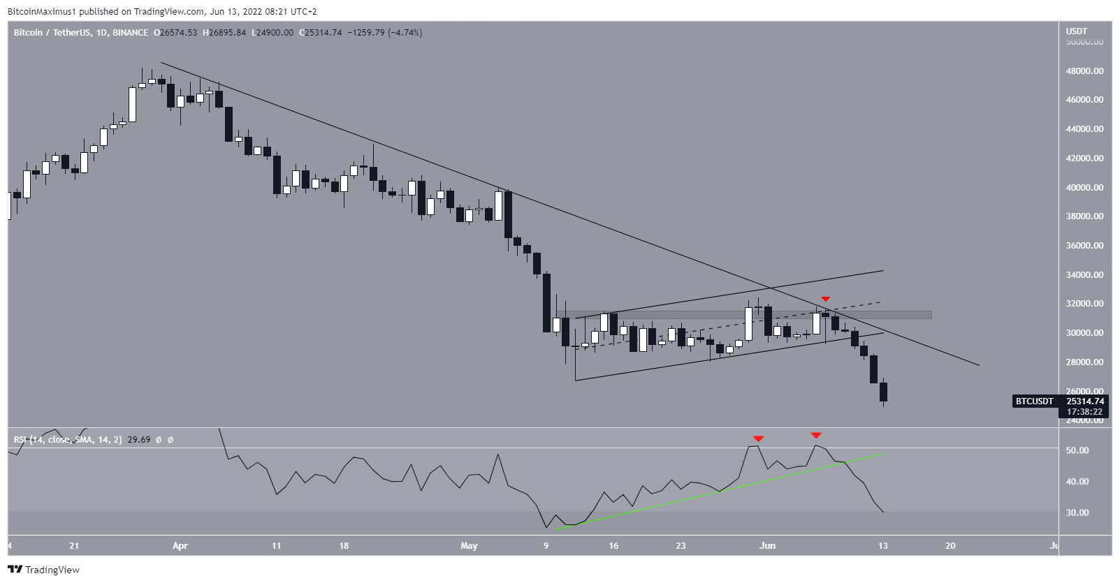 The daily chart shows that BTC had been increasing inside an ascending parallel channel since May 12. While trading in it, it proceeded to reach a high of $31,589 on June 7.