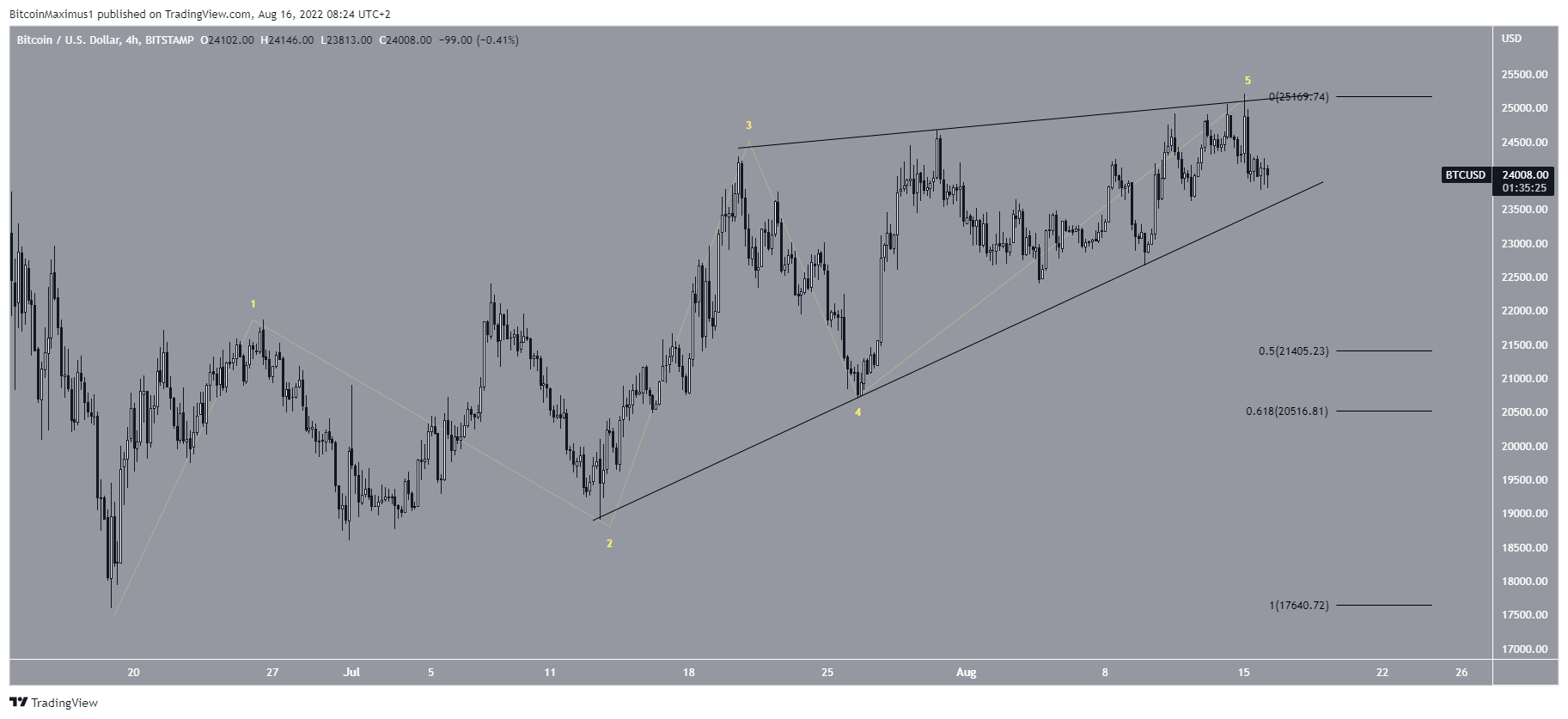 The alternative short-term count suggests that the entire upward move since June 18 is part of a leading diagonal, hence the shape of the ascending wedge. In this case, a breakdown from the wedge and subsequent decrease towards the 0.5-0.618 Fib retracement support levels at $20,500 to $21,400 would be expected prior to the continuation of the upward movement.
