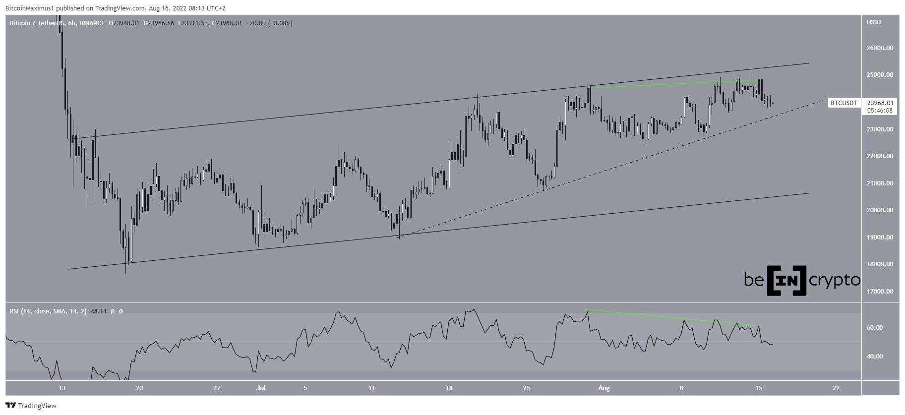 A potential breakdown from this support line could take BTC down to the support line of the channel near $21,000 or lower.