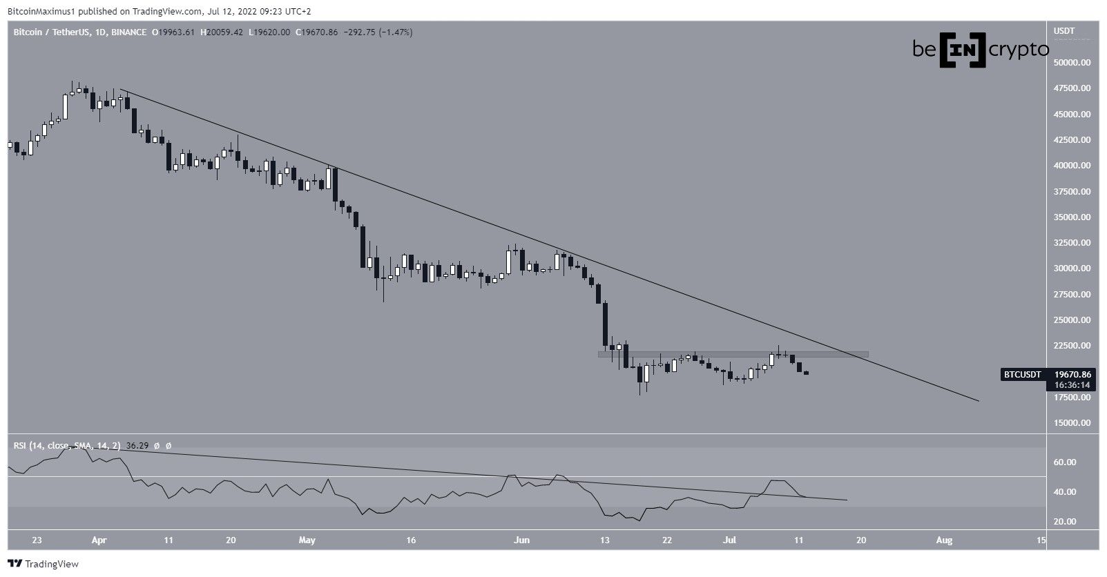 Bitcoin has been decreasing underneath a descending resistance line since the end of March. The last time the resistance line caused a rejection was on June 7. This led to a long-term low of $17,622 on June 18.Â