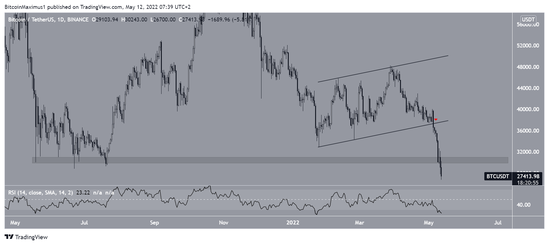 On May 10, BTC rebounded off the $30,500 horizontal support area, which had been in place since May 2021. However, the bounce was short-lived and the price broke down on May 11 and has now reached a long-term low of $26,700.