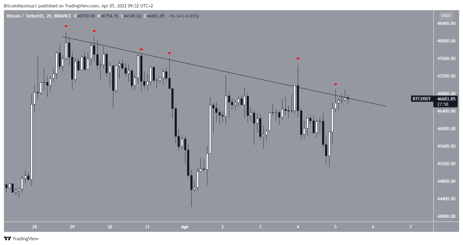 The two-hour chart shows that BTC has been following a descending resistance line since March 28. So far, it has made six attempts at breaking out (red icons) and is currently making its seventh attempt.Â
