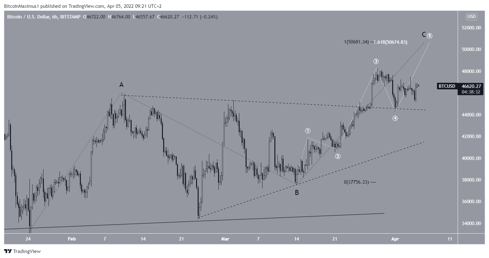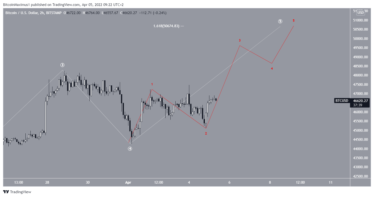 The two-hour chart gives an outlook on the minor sub-wave count (red). It suggests that BTC is currently in minor sub-wave three. A decrease below yesterday’s low of $45,214 would invalidate this particular wave count.