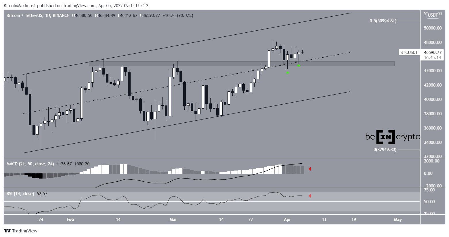 Bitcoin has been increasing inside an ascending parallel channel since Jan. 24. On March 27, it broke out above the midline of the channel and the $44,800 horizontal area.Â