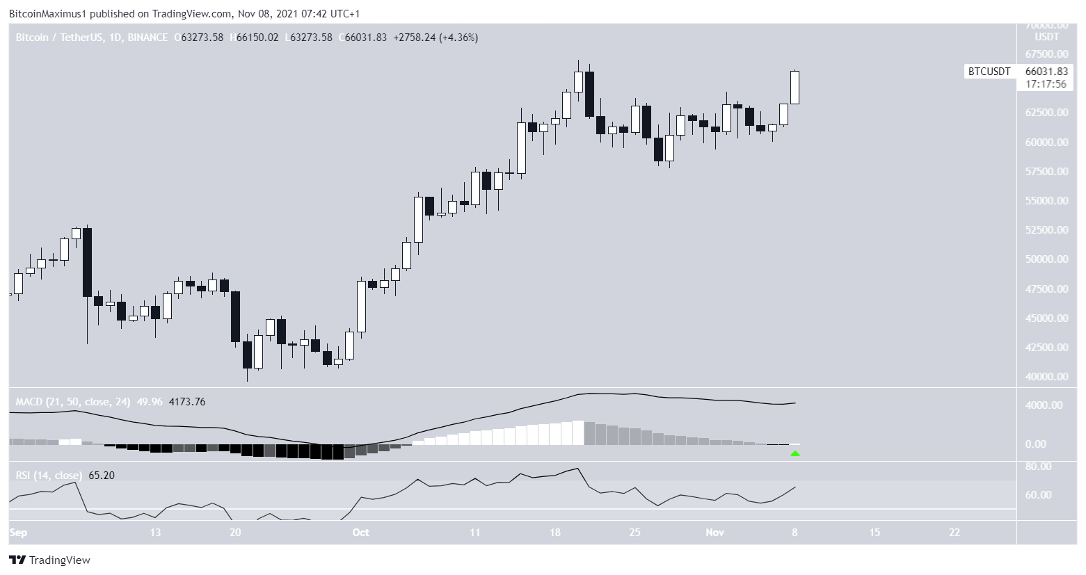 The daily chart shows that BTC is in the process of creating a large bullish candlestick and moving towards the $67,000 all-time high price.